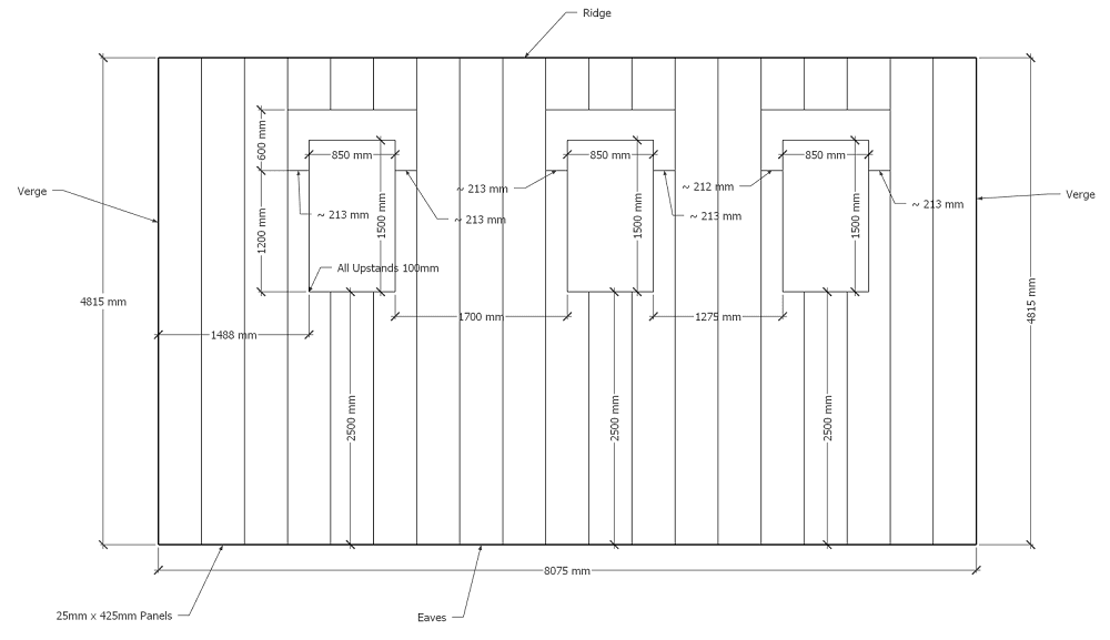 Planning for roof lights means ensuring the panel seams land in a suitable place along side the roof lights. A drawing like the example below helps provide the fabricators with clear instruction as to what exactly needs making for each project.